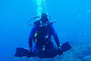 Thursday was to become my absolute highlight of the week. The first dive at the so called Twin Rocks was fantastic. Awesome diving spot, lots to see and at the start we went to visit a baby reef shark. But the most amazing part was to come, and that not even with any scuba stuff geared up! On our way to the second spot we came along two boats anchored along an island. There was obviously something there worth seeing. We quickly found out what they were here for as we spotted the dorsal fin and the wingtips of a Manta Ray at the surface. There was even more than one there. But we had just come out of a dive, were not even ready to snorkel and the engine noise scared them away. But only temporarily. They would come back and by then we were ready to jump in and swim right next to them!